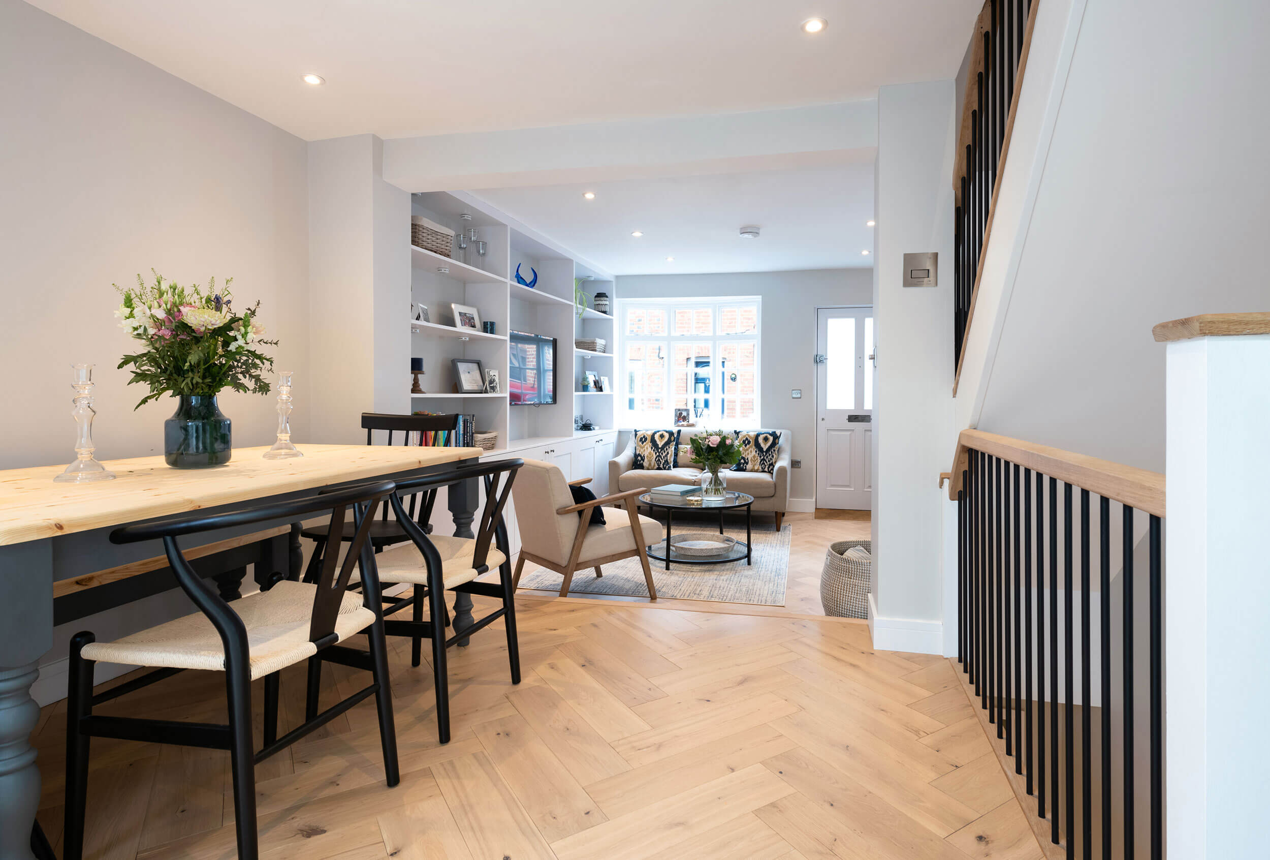 The open plan living room now has a bespoke staircase which provides access to both the upper and lower floors of the property. A fire suppression system gives peace of mind that the new living spaces, both above and below ground are fully compliant with building regulations and fire safety rules.